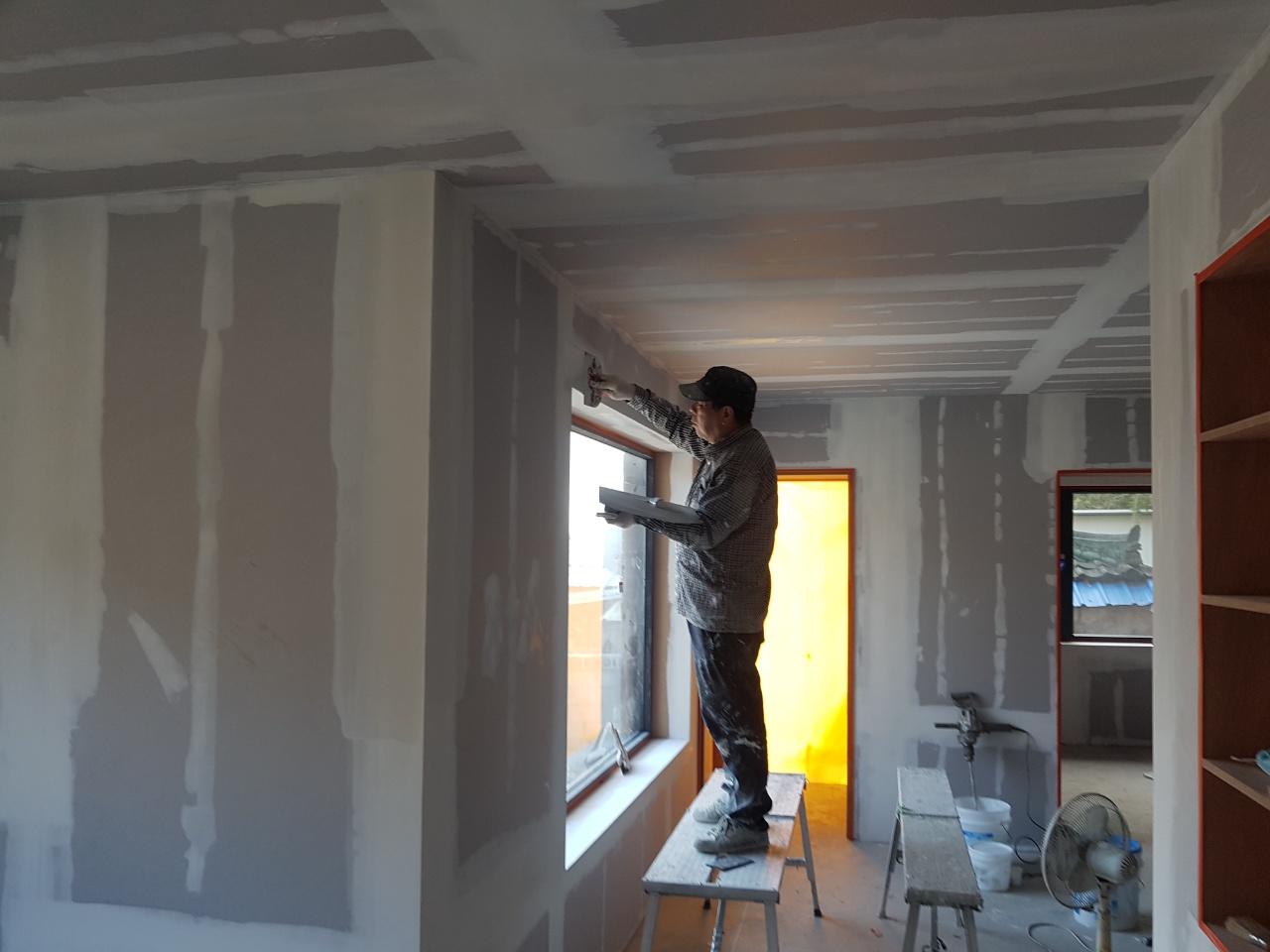 여기 저기 도배 발판 걸치고 타고 다니면서 석고 보드 위에
