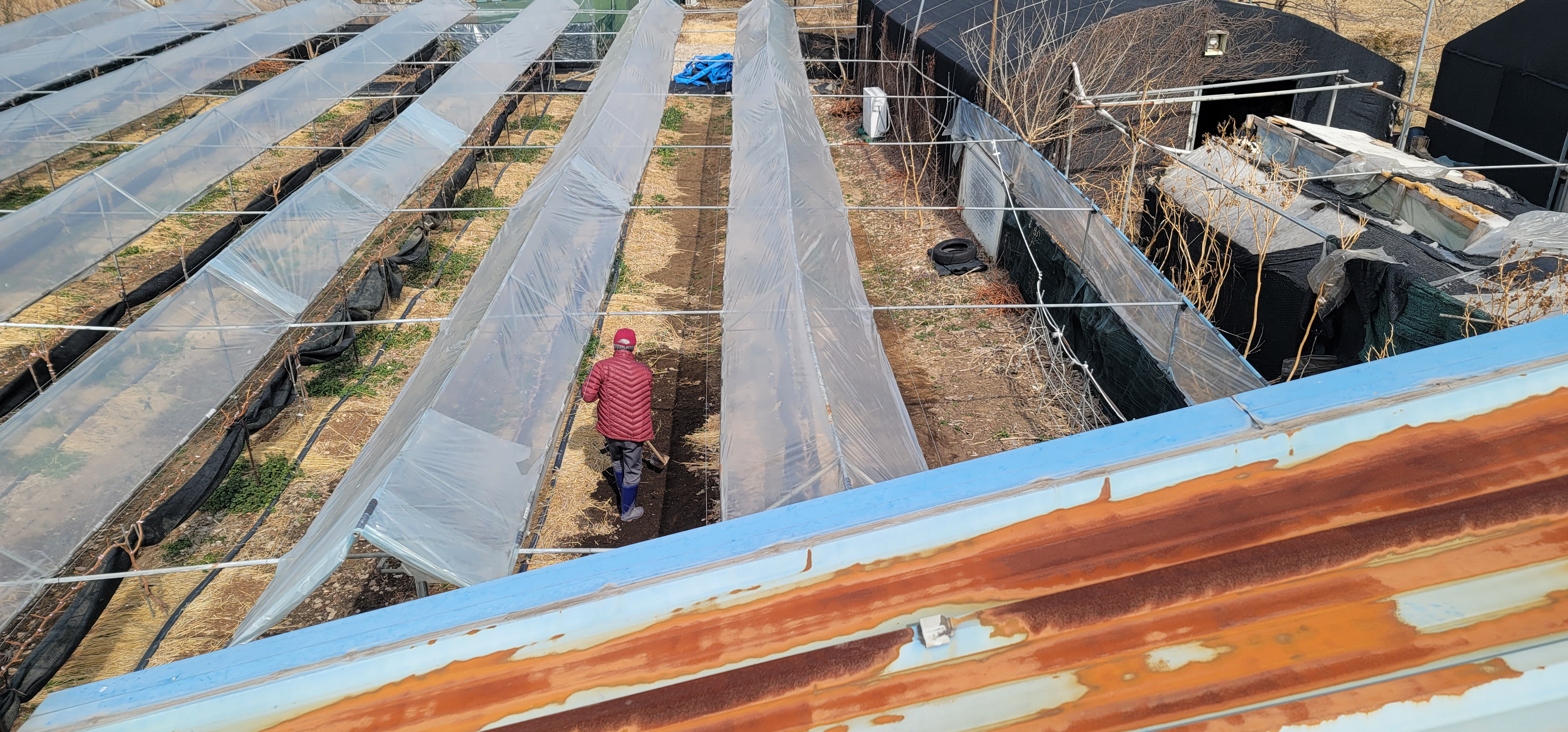 약 200m2 되는 단층 공장 지붕 판넬에 올라 갔다