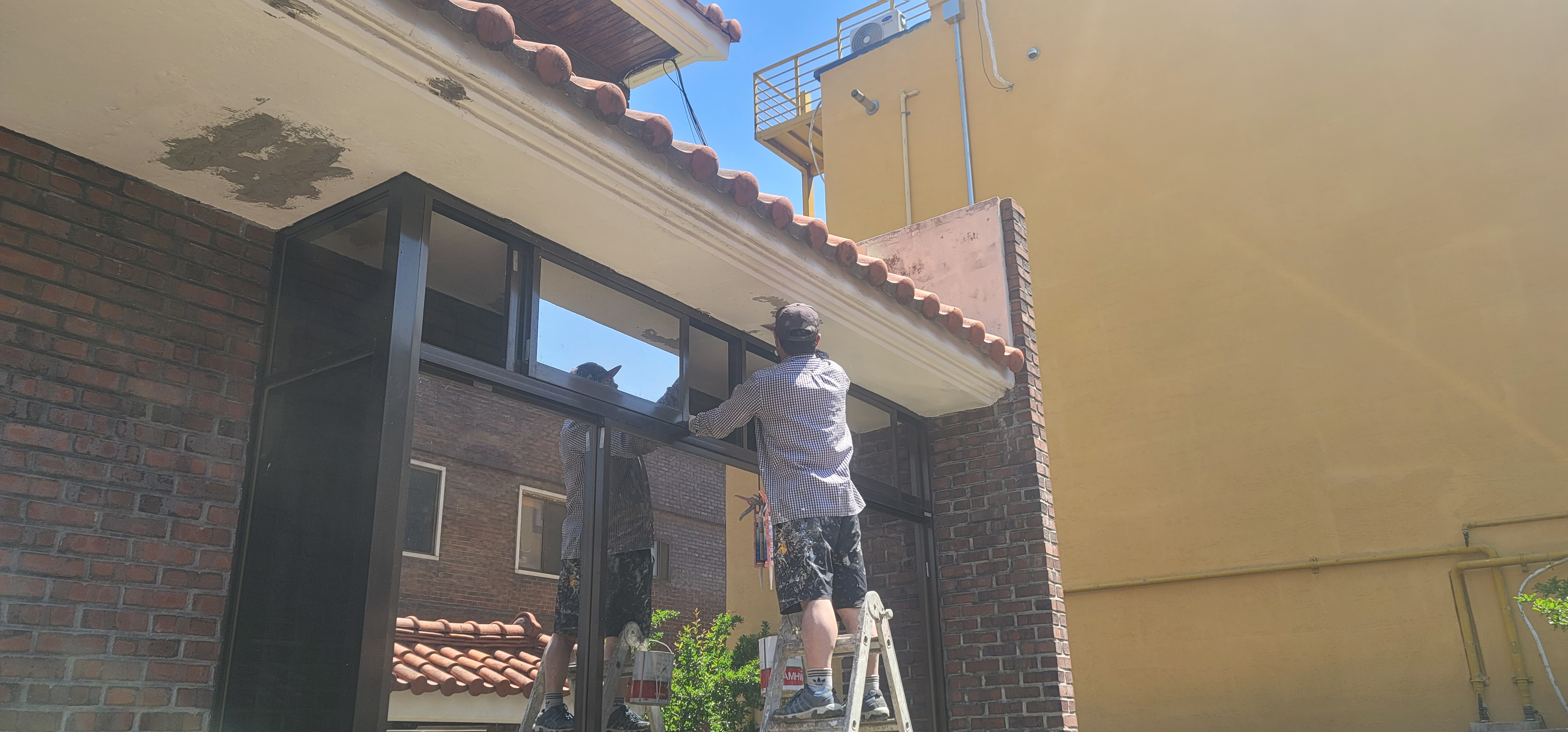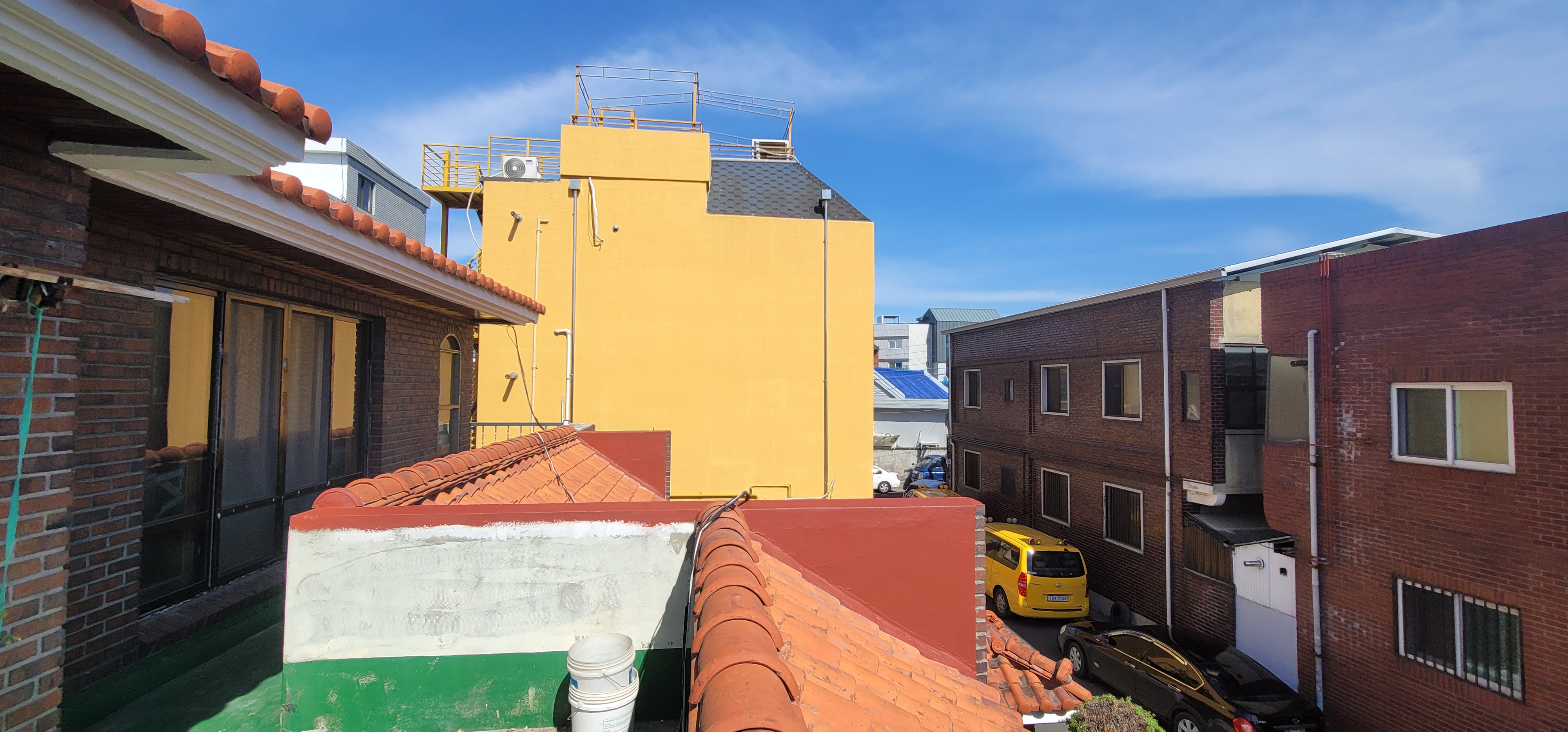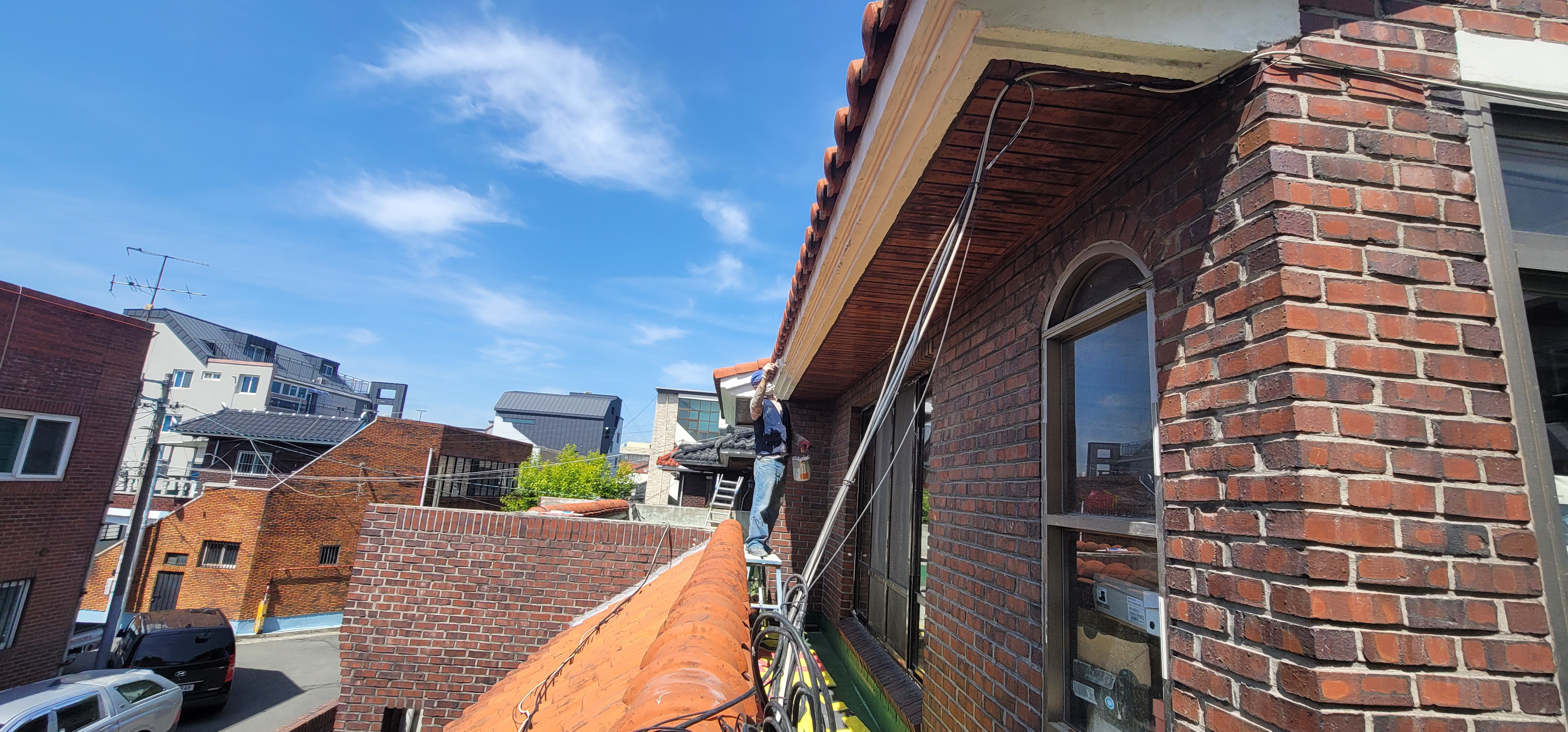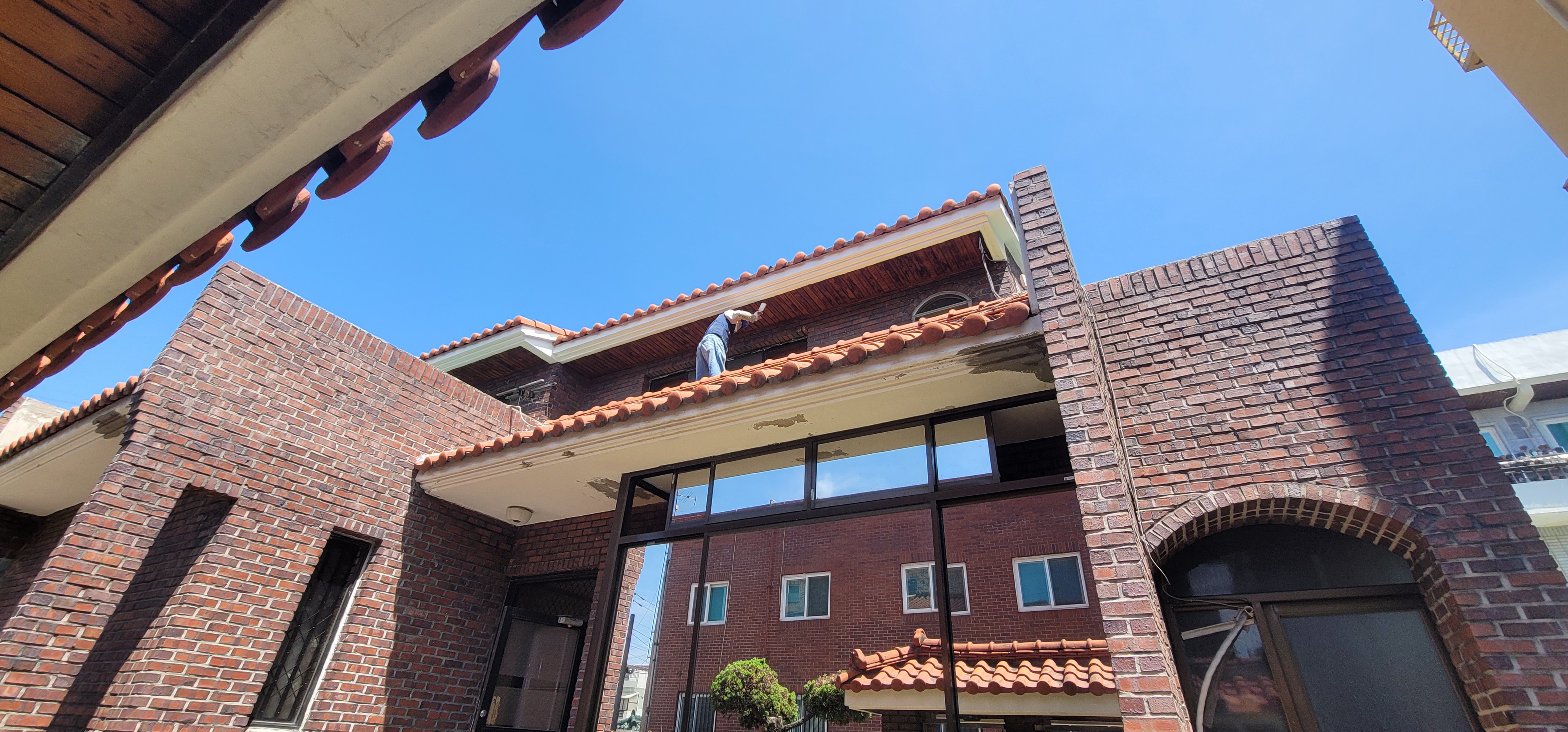 지붕 끝 백색 수성 페인트는 전부 붓으로 해야 한다