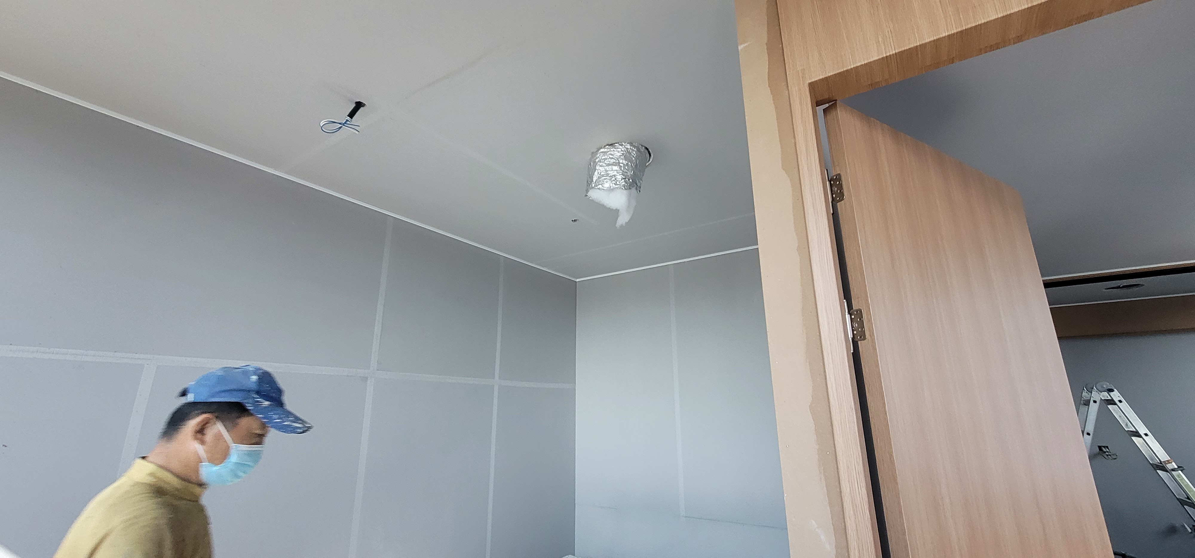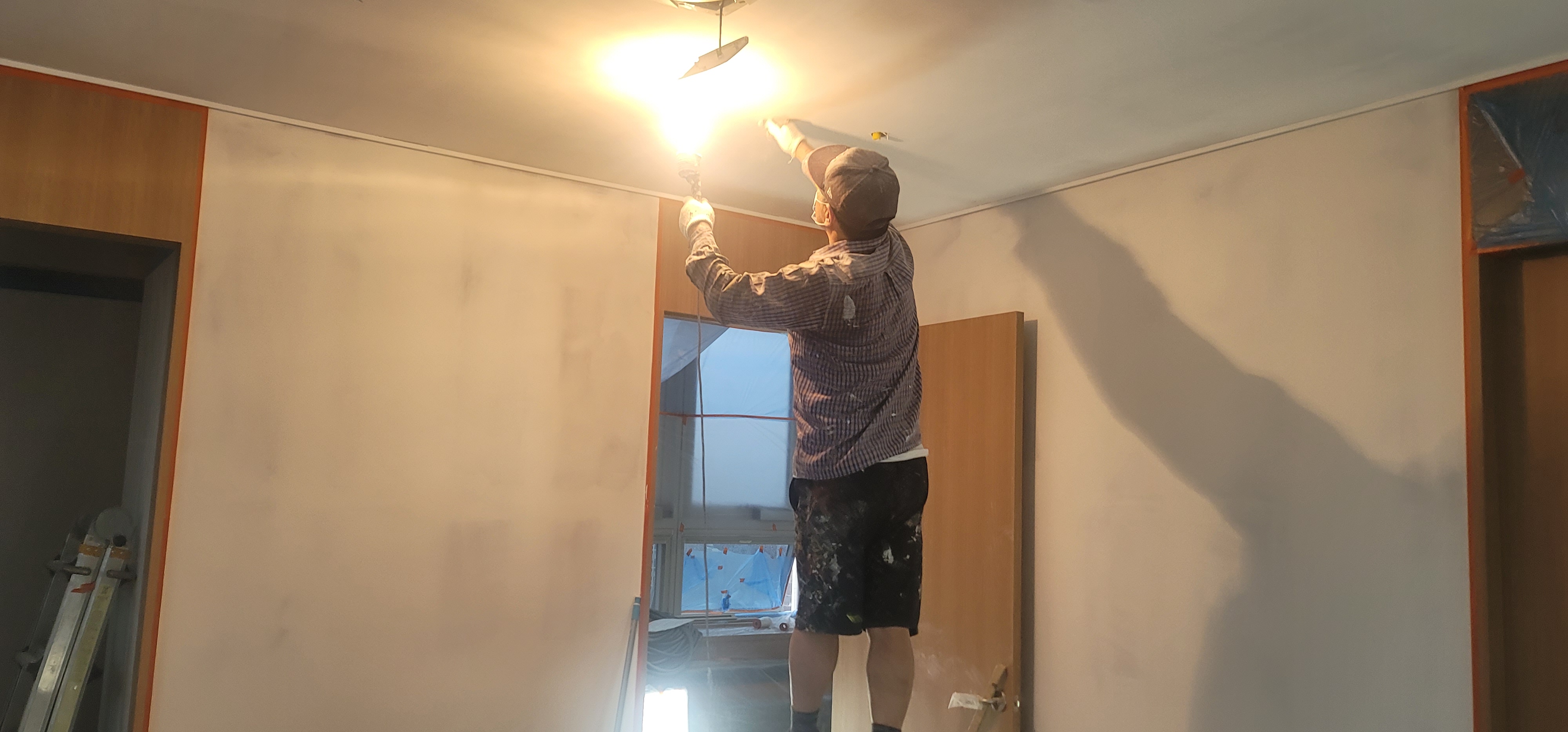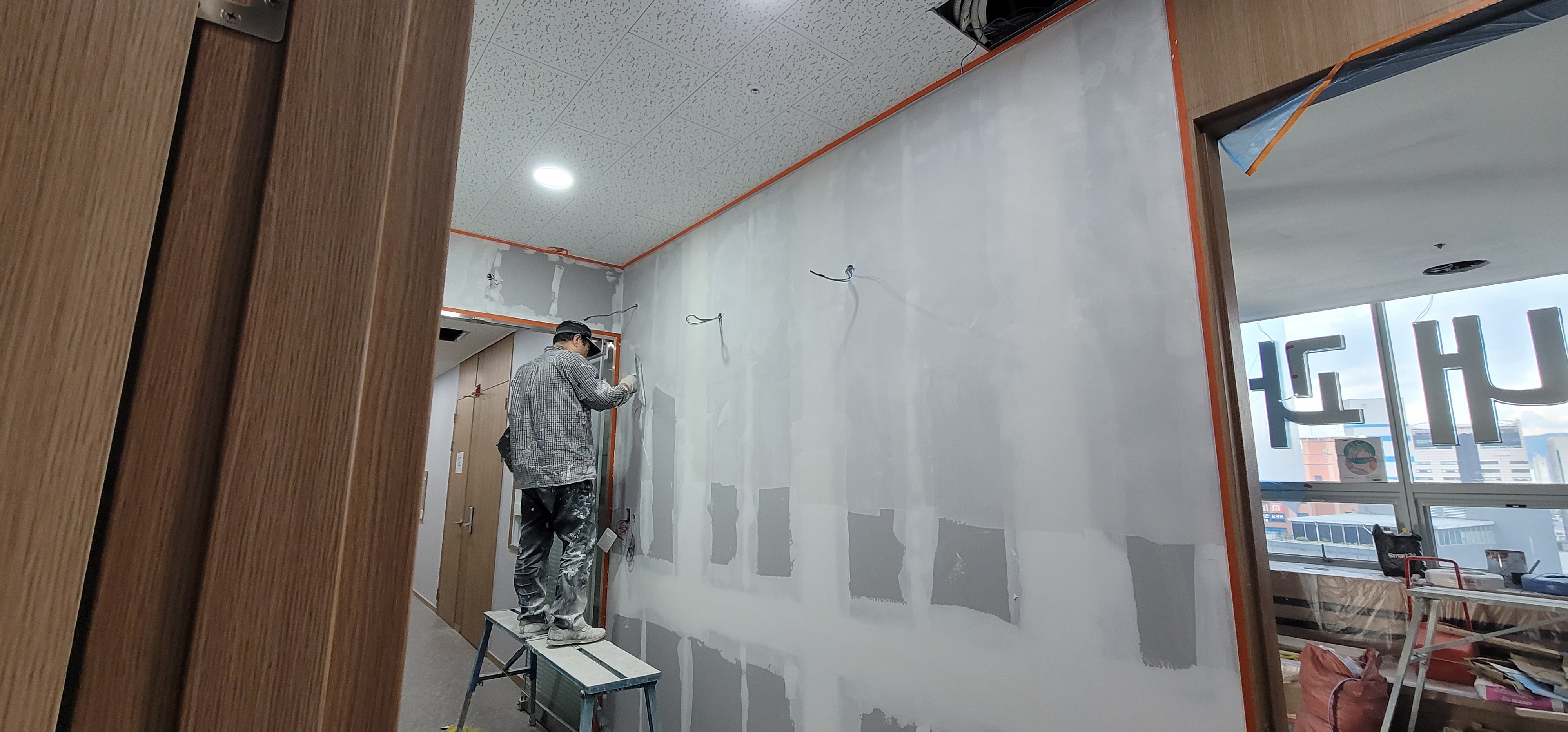 2022년7월19일(화) ☞아침 기온/22도 ☞날씨 맑음 구분: 4.석고 보드 벤자민무어 에그셀 광 Hot Line: 010-2229-7704 에제 석고 보드 위에 젯소롤 초벌 넣어 놓고 오늘은 최종 마감을 벤자민 무어 페인트 에그셀 광으로 마감을 한다 보통은 실내 분위상 차분한 무광을 하는데 이번은 에그셀 광으로 마감을 해야 한다 벽체나 천정을 이렇게 광이 나게 마감을 하면 무광 보다 힘이 배가 더든다 멀리서 오는 빛이 반사가 되어 오면서 빛의 산란으로 표면에 아부 적은 띠끌이나 요철도 노출 되기에 엄청 신경이 쓰인다 정식 두먼번을 벤자민 무어 페인트 에그셀 광을 에어레스 뿜칠로 힘은 덜었지만 보람을 느낀다 선풍기로 강페 건조 시키고 테이프 제거 까지 하고 철수 했다 모바일 홈피-가보기 2022년7월1..