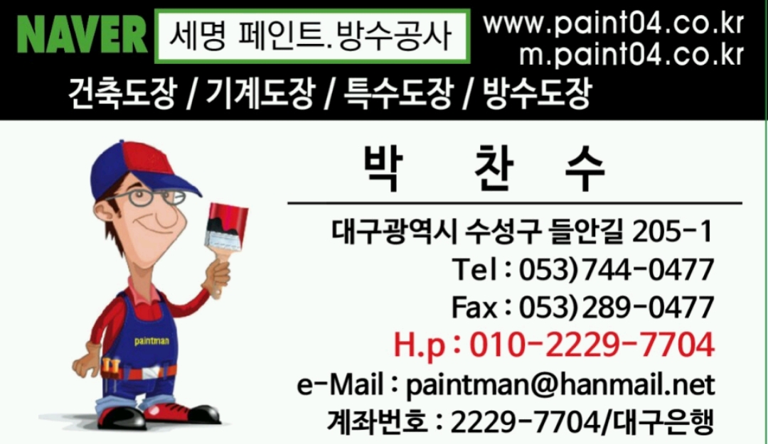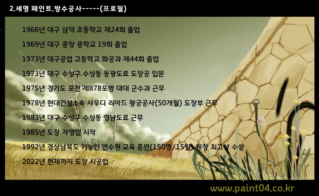 안녕 하세요 세명 페인트 방수공사 홈페이지 방문을 해 주신 고객님에게 진심으로 감사 드립니다 저는 대구광역시에 거주하며 1773년 부터 현재까지 도장(페인트) 시공업 전문으로 45년 유경험의 축척된 기술력의 노하우를 고객님에게 페인트/방수에 관한 기술 자문.공사 견적.공사 시공.A/S까지 최선을 약속하는 세명 페인트. 방수공사 입니다 세명 페인트 방수공사는 크고 작은 공사에도 정확.정밀.정직성의 시공으로 늘 고객님과의 약속을 소중히 생각하고 더불어 함께 하는아름다은 세상.밝은 사회.푸른 공간을 함께 만들어 가겠습니다. 감사 합니다 2010.07.01 세명페인트 방수공사 박찬수 드림