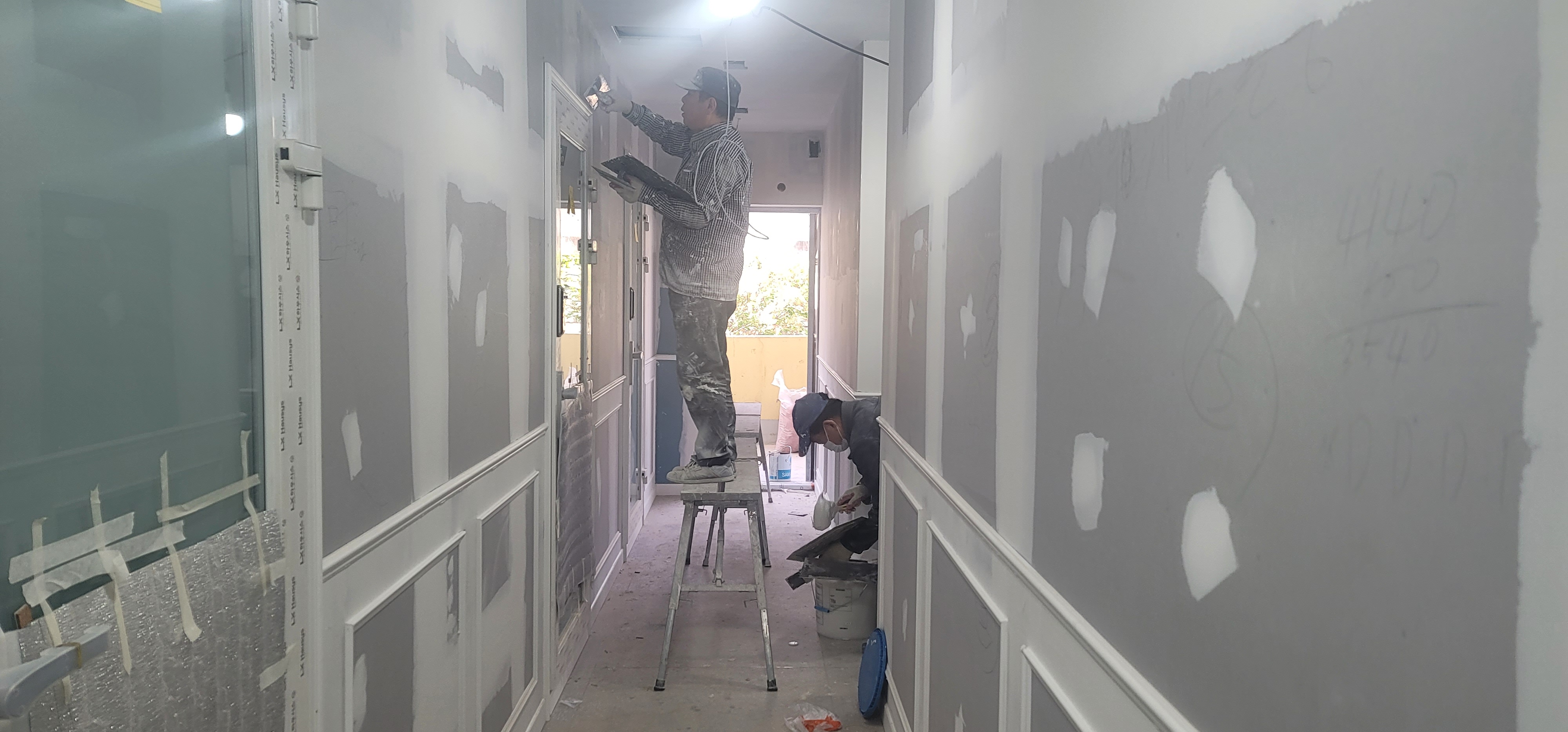 대구시 범어동 음악 연습실 복도 석고보드 인테리어 페인트-4.올퍼티 사포질 2022년4월18일(월) ☞아침 기온/10도 ☞날씨/맑음 구분: 석고 보드 작업: 올퍼티 사포질 HOT Line: 010-2229-7704색시공 올퍼티에 사포질은 아무나 하나 180번도 안된다 꼭 220번 사포로 쳐야 한다 180번 사포는 요철 부분을 없애기는 좋지만 잘못 치면 표면에 자국만 남는다 2층 계단에서 올라 오는 공기가 작업하는 복도를 지나 비상구로 잘도 빠져 나간다 환풍기 두대로 퍼티 분진을 빨아 내며 구석 구석 200w 전구를 들고 사포질을 하는데 밀가루 공장이 따로 없다 작업복과 장갑이 하얗게 분진에 너무 더럽다 늦은 시간에는 강력 송풍기로 분진 불어 없애고 코너와 웨인스 코팅 에 수용성 씨리콘 쏘아 놓고 퇴근했다..